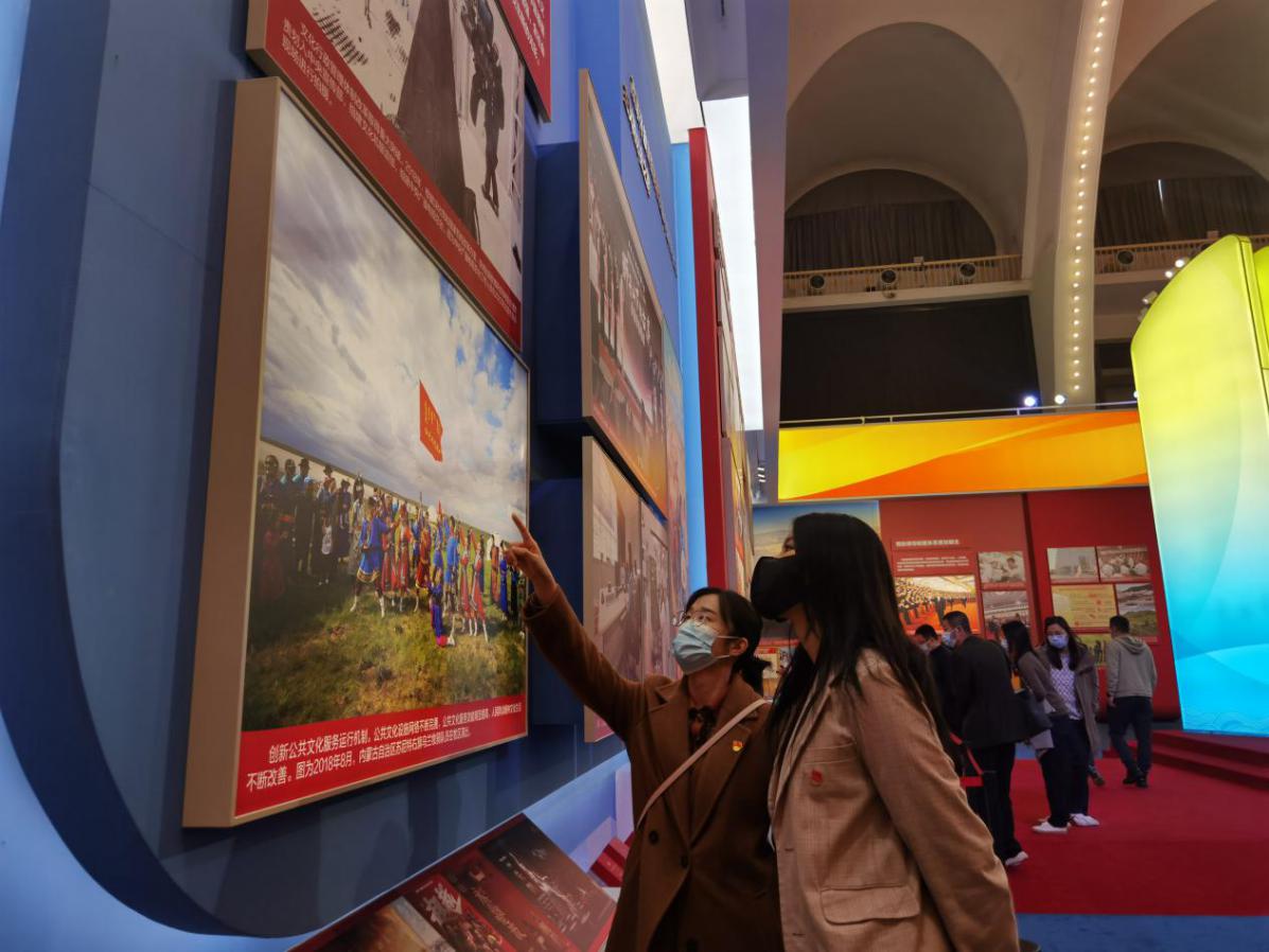 图丨团员青年们观看《创新公共文化服务运行机制——内蒙古牧区演出场景》图片