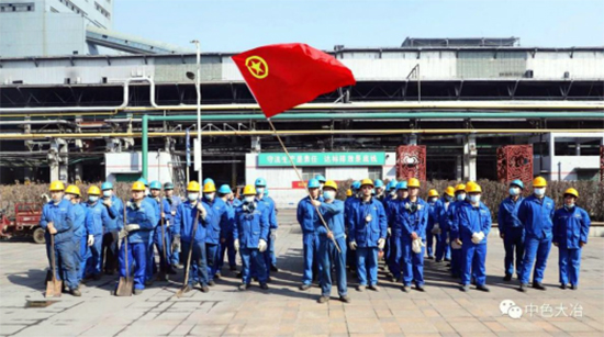 中色大冶冶炼厂团员青年对相关区域的卫生和含铜物料进行清理、回收