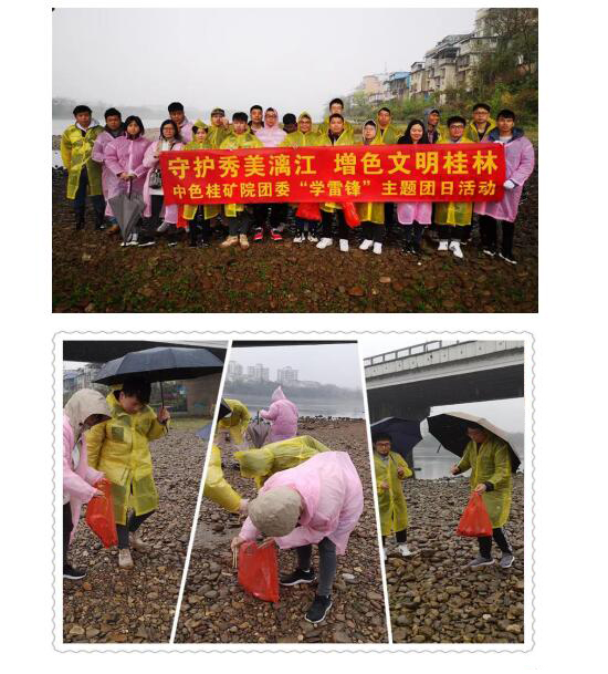为进一步传承雷锋精神,3月5日,中色桂矿院团委组织团员青年开展了以“守护秀美漓江、增色文明桂林”为主题的学雷锋主题团日活动。来自中色桂矿院7个团支部的22名团员青年积极响应,迅速行动,到漓江边虞山桥至伏波山江段沿线,捡拾江边的烟头、塑料等垃圾。虽然桂林下着蒙蒙细雨,但他们热情不减、干劲十足。