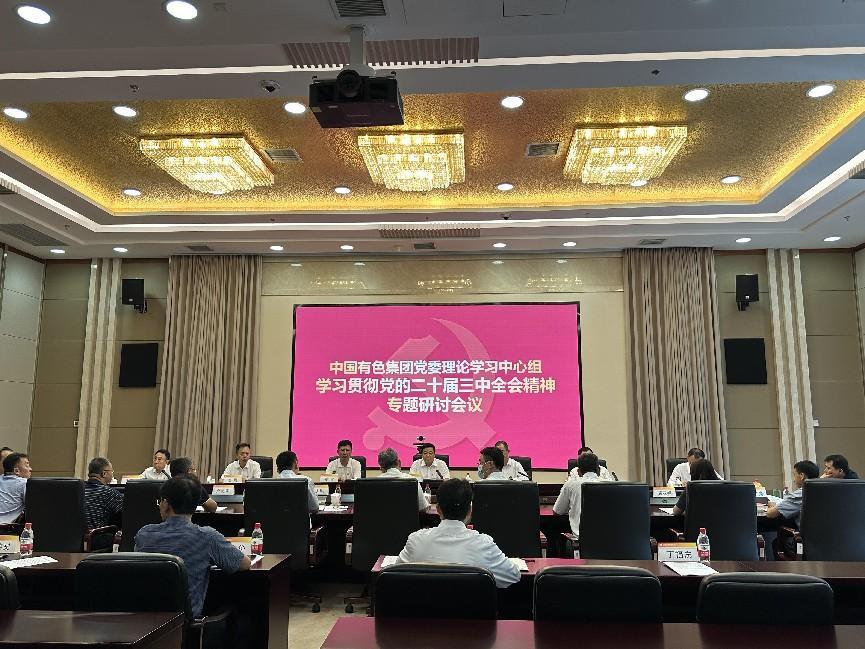 根据党中央关于学习贯彻党的二十届三中全会精神的重要部署,以及国务院国资委党委有关工作要求,8月30日,中国有色集团党委召开理论学习中心组党的二十届三中全会精神专题学习研讨会议,集中学习党的二十届三中全会精神,重温习近平总书记对集团公司三次重要指示批示精神,就集团公司全面抓好贯彻落实,加快推动高质量发展开展集中研讨。中国有色集团党委书记、董事长主持学习,领学三中全会精神重点内容并作研讨重点发言,党委副书记、总经理领学习近平总书记重要指示批示精神并作研讨重点发言,集团公司领导班子成员参加学习研讨。
