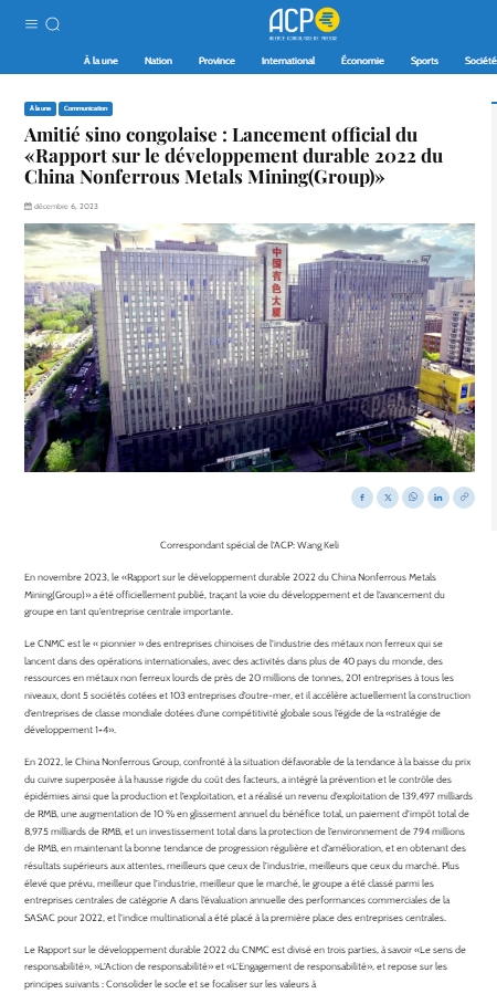 2023年12月7日,刚通社发布《中国有色集团2022可持续发展报告》,这是该社连续第二年对集团公司可持续报告进行重点宣传。