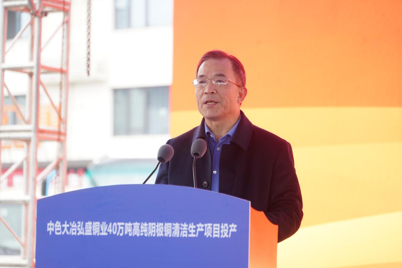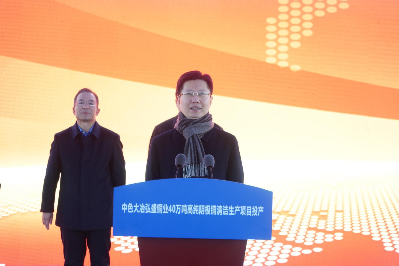奚正平代表中国有色集团向黄石市委市政府和合作伙伴给予中国有色集团和中色大冶的关心和支持表示衷心感谢。他表示,弘盛铜业40万吨高纯阴极铜清洁生产项目正式投产,吹响了迈向铜产业第一方阵的前进号角。中色大冶要接续奋斗、砥砺奋进,以安全生产为前提、强化管理为基础、改革创新为抓手,早日实现满负荷正常运营,全面夺取项目达产达标的新胜利;要立足最佳、做强做优,发挥头雁效应、对标世界先进,着力打造世界先进水平的铜冶炼项目新标杆;要不忘初心、牢记使命,以绿色高质量发展彰显央企的责任担当。