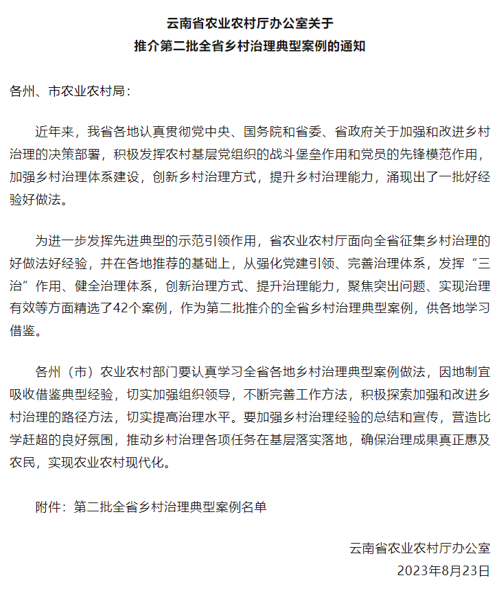 根据云南省农业农村厅关于推介第二批全省乡村治理典型案例的通知,中国有色集团定点帮扶云南省德宏州梁河县河西乡平易村入选云南省第二批全省乡村治理典型案例。这是对平易村党支部、集团公司选派驻村第一书记和全体村民共同努力的肯定和表彰,也是平易村发展的里程碑。