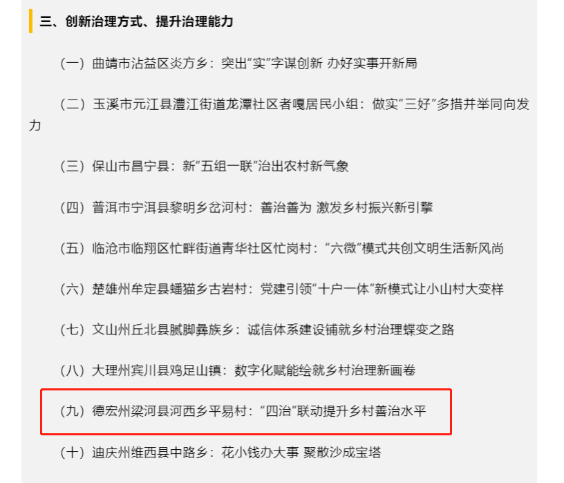 近年来,平易村积极贯彻党中央、国务院以及云南省省委、省政府的决策部署,在梁河县和中国有色集团的指导下,努力加强和改进乡村治理工作,现出了一批好的经验和做法。平易村党总支与中国有色集团2个支部积极开展党建共建,坚持党建引领,以农民自治为基础,以“支部领治、群众自治、群团协治、政企参治”四治工作法为指导,注重群团协作和政企参治,不断推动协作联动、齐抓共治的乡村治理新格局的建设,创新治理方式,提升治理能力,促进乡村治理体系建设和发展,得到了云南省农业农村厅的高度认可,被推介为全省乡村治理的典型案例。