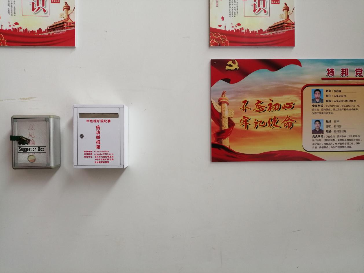 基地在办公楼一楼大厅食堂墙面(无监控)设立一个信访举报箱。如下图: