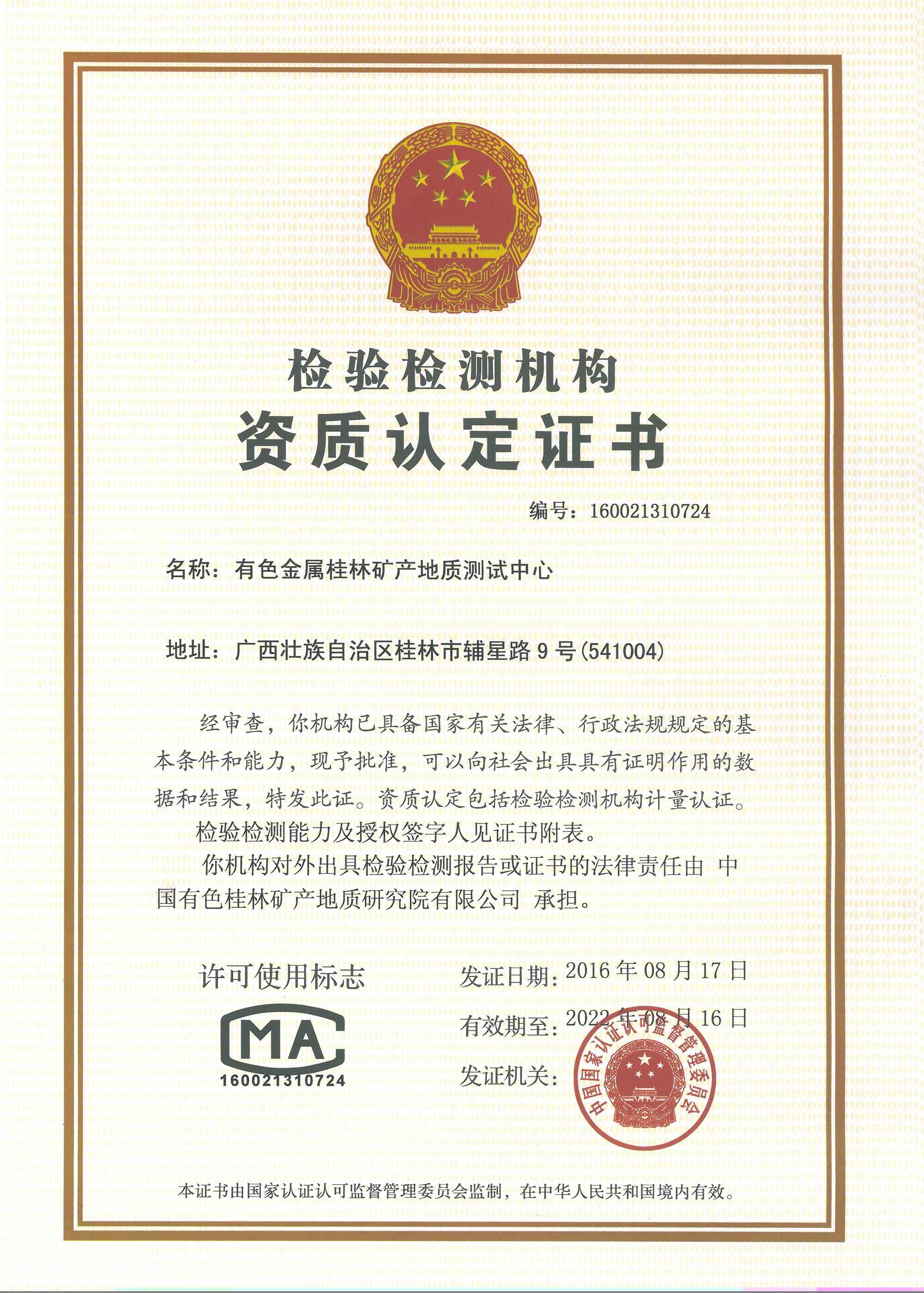 | 2016.8.17.-2022.8.16. | 国家认证认可监督管理委员会 | 测试 中心 | 有色金属桂林矿产地质测试中心 |