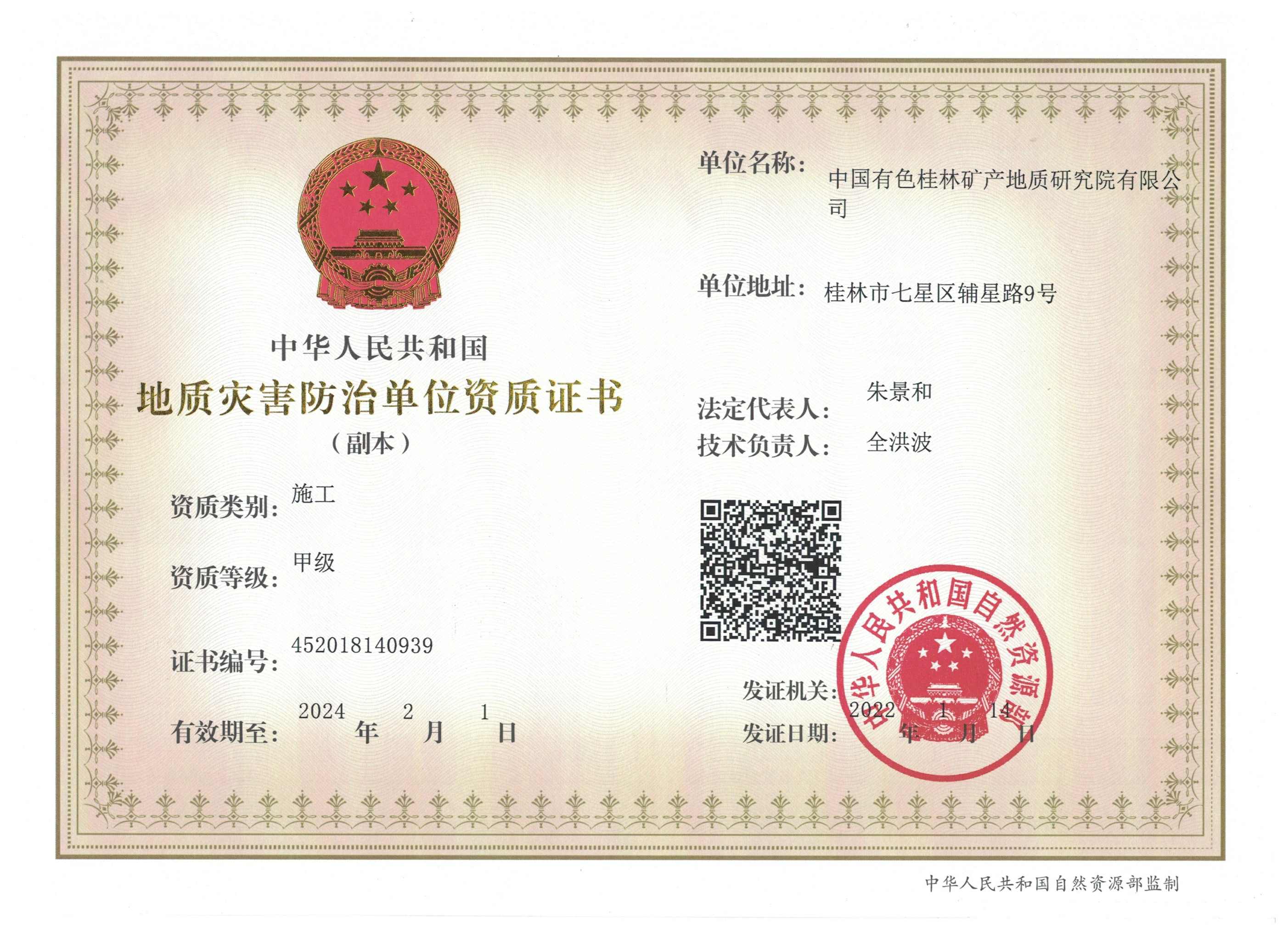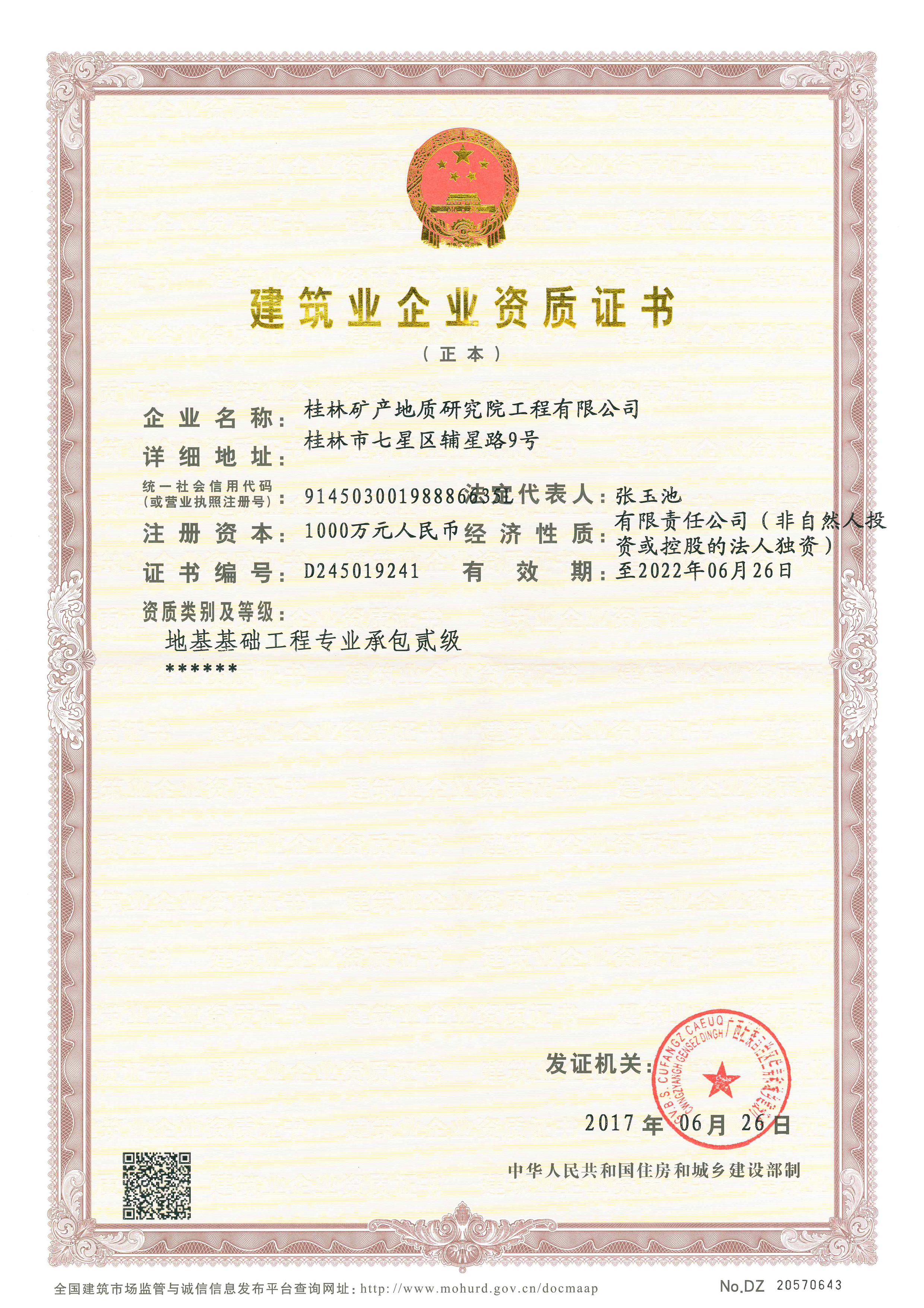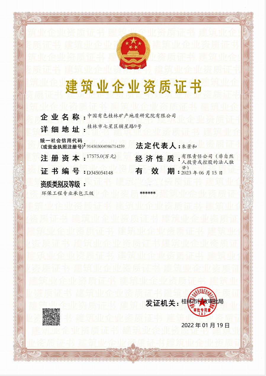 | 2020.5.29-2025.5.29 | 广西壮族自治区住房和城乡建设厅 | 工程 公司 | 桂林矿产地质研究院工程有限公司 |