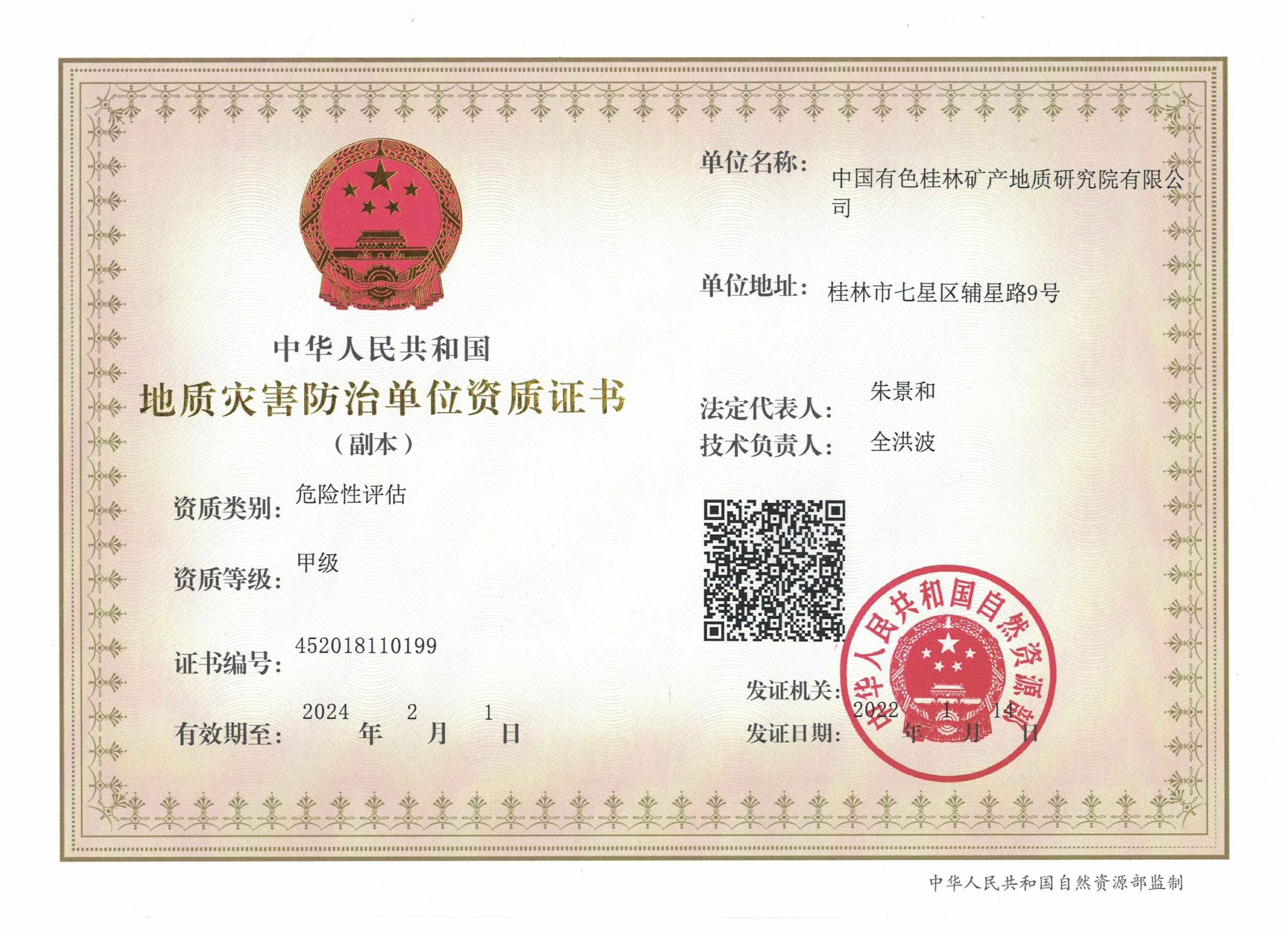 1 | 地质灾害防治危险性评估 证书编号:452018110199 | 甲级 | 2018.2.28-2021.2.28 2021.2.2-2024.2.1 | 中华人民共和国国土资源部 | 博泰 环保所 | PA捕鱼 |