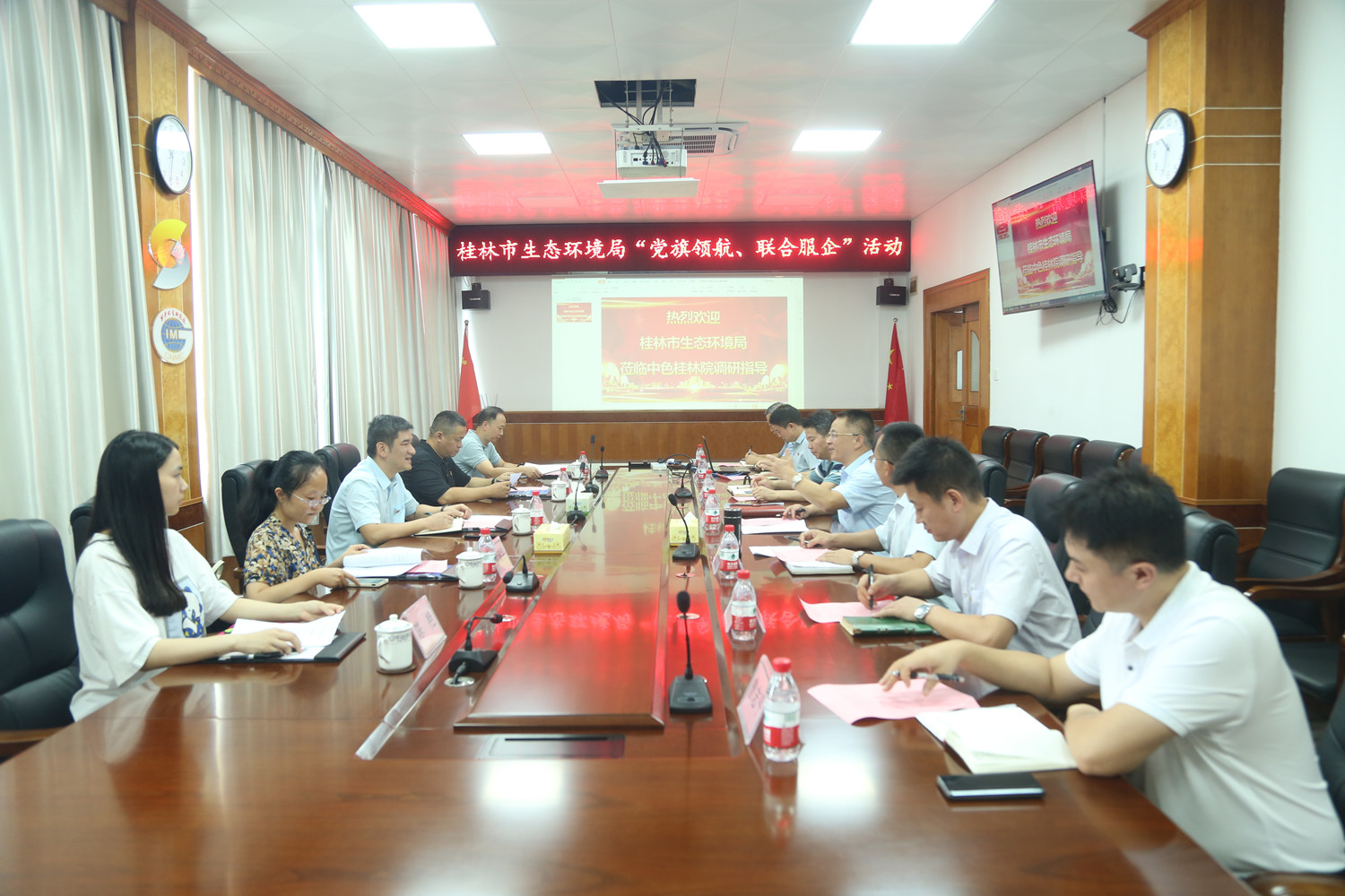 8月6日上午,桂林市生态环境局副局长熊小斌一行到PA捕鱼开展“党旗领航 联合服企”走访调研活动,并进行座谈交流。PA捕鱼党委书记、董事长、总经理杨国高、党委委员、副总经理赵延朋热情接待了熊小斌一行。PA捕鱼党群综合办、安全环保部、生态环境事业部、测试中心负责人参加座谈会。